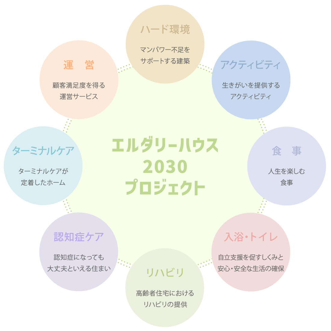 2030年の高齢者住宅がいかにあるべきかその高齢者住宅モデルを作ろうと、高齢者住宅支援事業者協議会で8つの分科会を組織し、参加企業の専門的見地から1年間の協議を積み重ね、各社の意見を集約し2020年5月に報告書としてとりまとめました。
