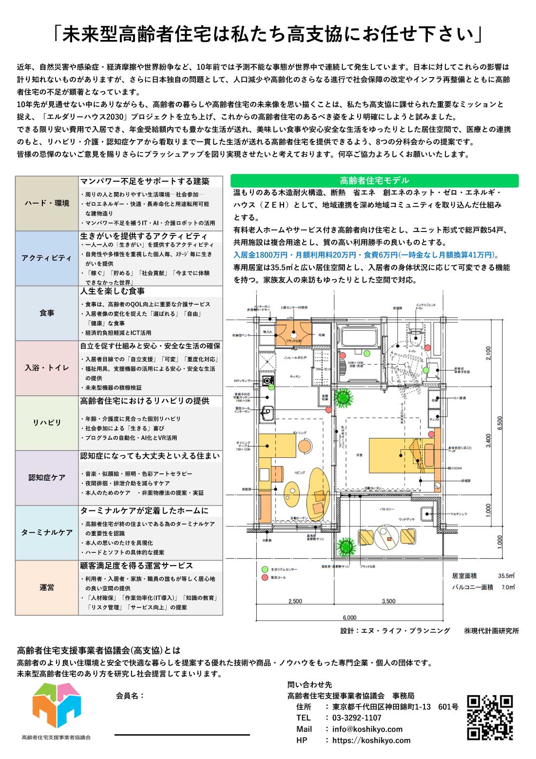 コンセプトは「入居者がこれまでの暮らしを継続できる」住宅です。生活に必要な水回り設備を設置し、入居者の身体状況によって可変出来る機能を持たせましてした。また、天井走行リフトによって、入居者の自立支援とスタッフの負担軽減をはかります。心地よう空間を実現するため、ダイニング・リビングやバルコニーのスペースも設けてあり、家族や友達が来てもゆったり過せます。狭い居室では、生きる活力が生まれません。2030年に向けて、35.5㎡の居室を提案します。