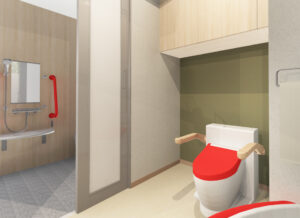 加齢による視力低下で視野が狭まることから便座や手摺などの色を目立つようにします